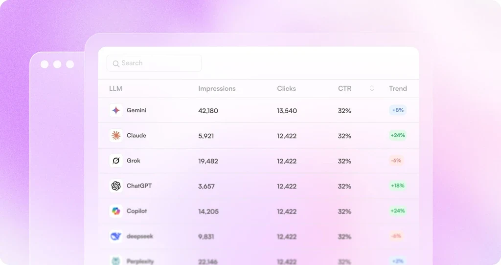 Track real AI-bot traffic. Get detailed insights into visits, impressions, and clicks from major models like ChatGPT, Gemini, Claude, and more.